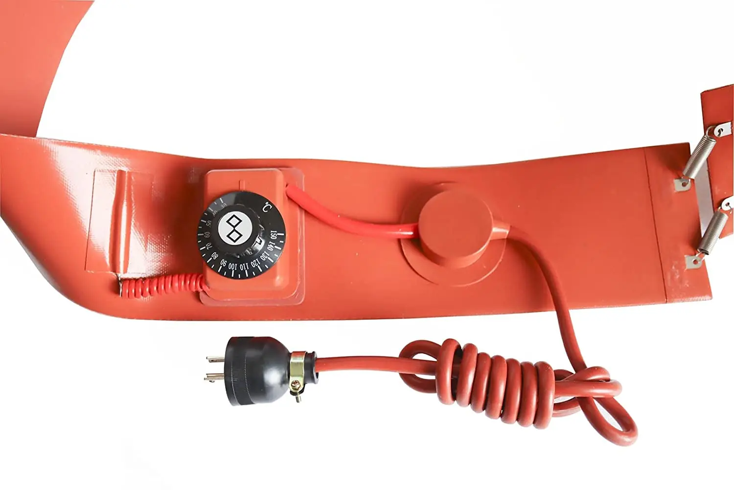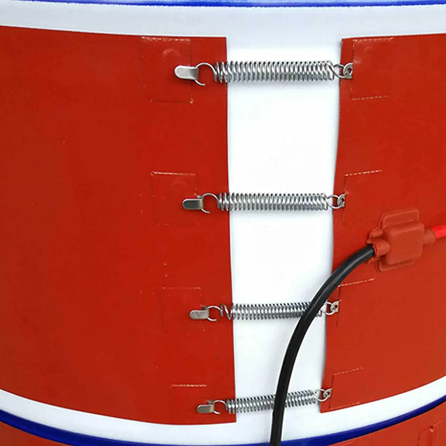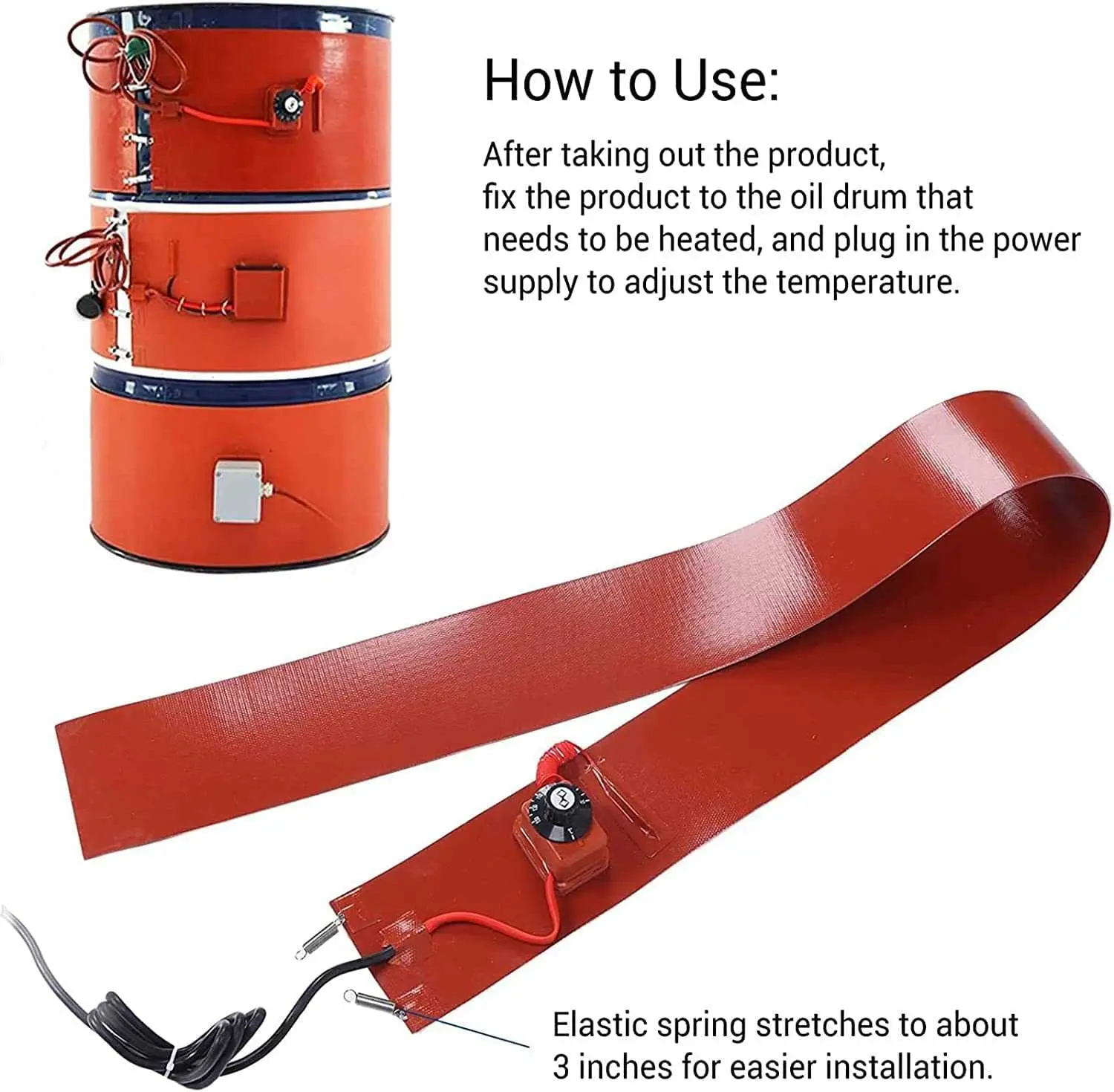 Fits 20L 30L 100L 150L 200L gallon drums.Ideal for heating up WVO for settling or processing biodiesel. This heater is controlled by a an adjustable thermostat.Flexible springs are used to attach the silicon heater around various diameter drums. The springs can stretch up to about 3 inches.For plastic drums, it is recommended to keep the thermostat set below 100°F (37°C)