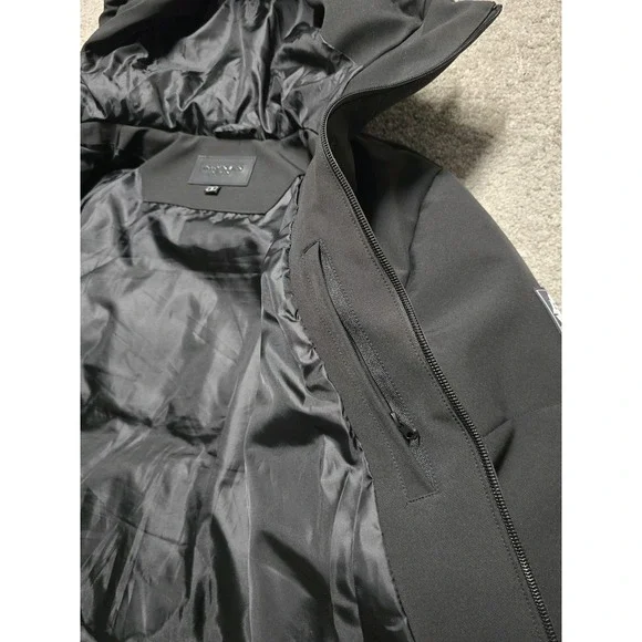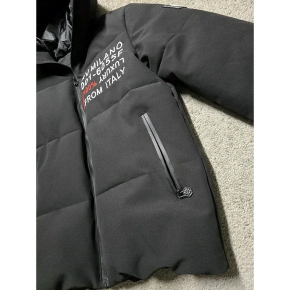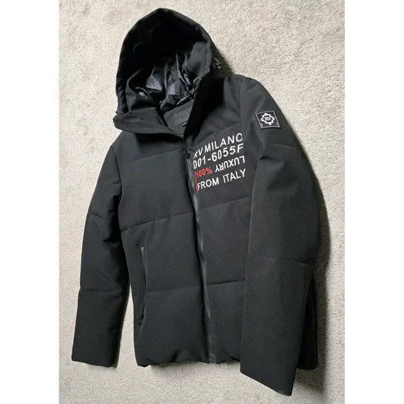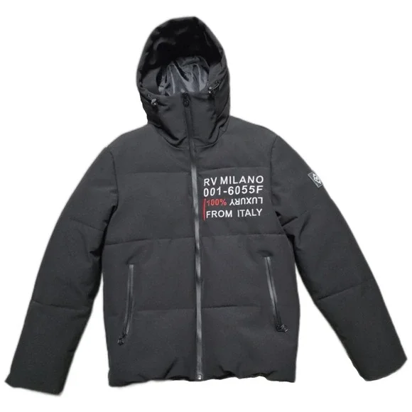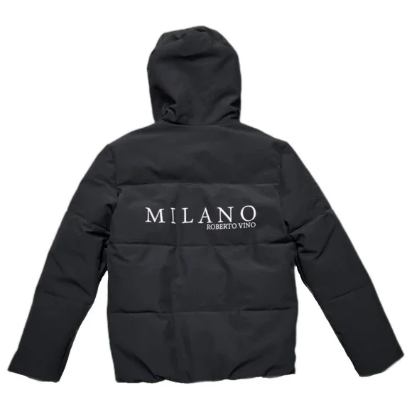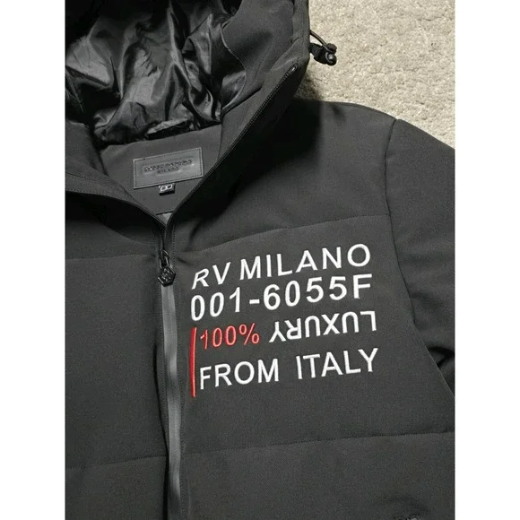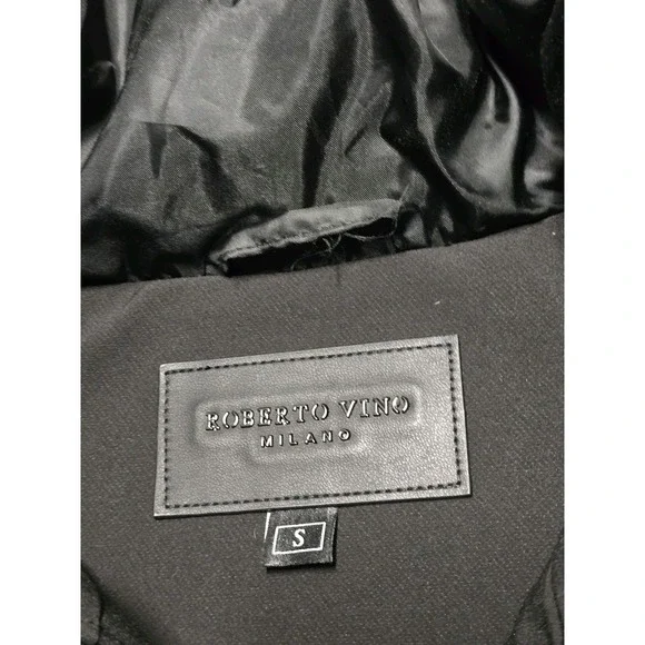 PRE-OWNED. GREAT CONDITION. A COUPLE SMALL MARKS. HARDLY NOTICEABLE. SHOWN IN PHOTOS.Robert Vino Milano Black Puffer Coat Jacket Mens Small DesignerThis item is pre-owned. Therefore, measurements may differ from original sizing. If you are unsure about the size, please flat lay an item of your own and compare measurements with ours.The Robert Vino Milano Black Puffer Coat Jacket for men in size small is a designer piece that exudes a 90s vibe. Made with polyester outer shell and lining material, this coat features embroidered details and a zip closure. Ideal for both party and casual occasions, it comes with a removable hood for added versatility. The regular fit and stylish puffer design make it a perfect choice for the winter season, adding a touch of luxury to any outfit.