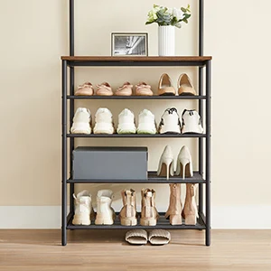 VASAGLE coat rack, dresses stand, wardrobe with 5 double hooks, shoe rack with 5 levels, one shelf on top